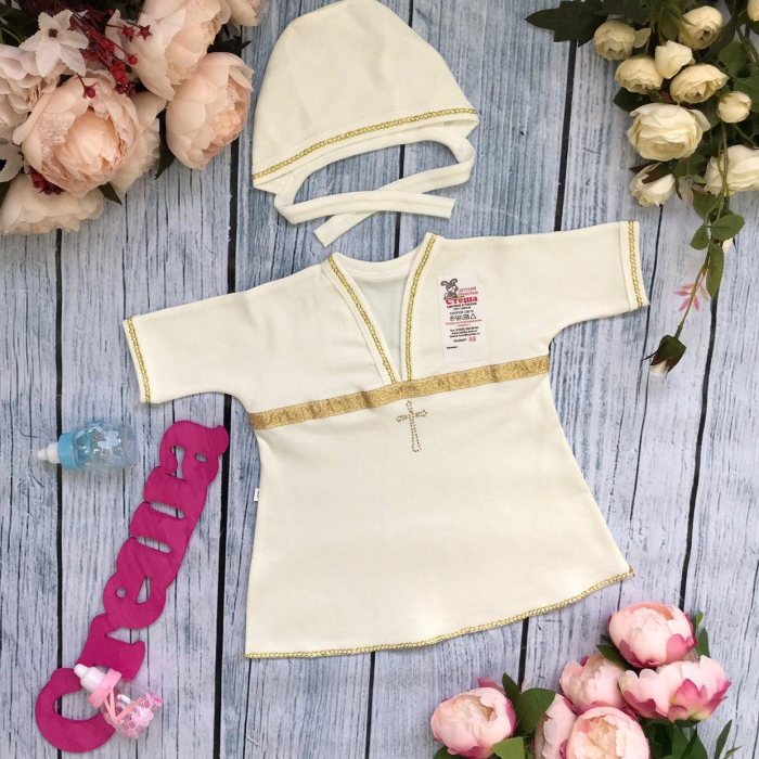 170. Крестильная рубашка с чепчиком (золото), хлопок 100 % интерлок 62,68,74,80